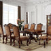 Add elegance to your dining area with this beautifully carved table and hutch. The table has two pedestals and matching padded chairs. The hutch has dramatic carvings, hardware and plenty of display space.
